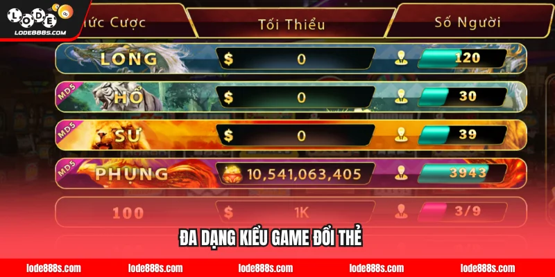 Bài đổi thẻ cào LODE88 mang đến phiên bản Mậu binh với nhiều biến thể hấp dẫn như Mậu binh thường, Mậu binh binh lung, Mậu binh 4 người. Đặc biệt, còn có tính năng gợi ý xếp bài tự động giúp người mới dễ dàng làm quen với luật chơi phức tạp, cùng với đó là các giải thưởng đặc biệt cho những bộ bài hiếm như Thùng phá sảnh, Tứ quý…